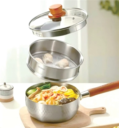 此外还有纯钛雪平锅可选,搭配蒸笼设计,一锅多用。轻松搞定全家人的早餐。不易生锈变形,烹饪效率翻倍。
