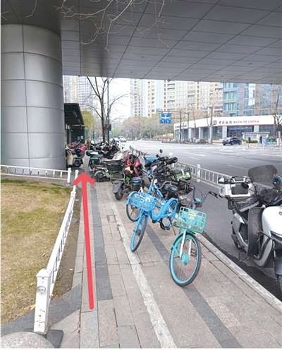 橙友“老好人”向橙柿直通车反映:乐堤港东门附近天桥下,有一段人行道被乱停的非机动车挤得行人都无法走路。此问题存在已有一年之久,请相关部门采取有效措施。