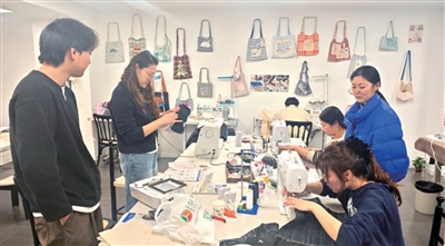 店里两位年轻女孩正专注地学习缝纫,她们自己挑选了碎布,拼接做帆布袋。一个说:“很有意思,从啥也不会,到学会穿针引线,会缝纫,你知道一些拼接料,边边角角的,原本生活里都觉得是废品,通过缝纫,竟能成为一件艺术品,这种感觉真的好神奇。”