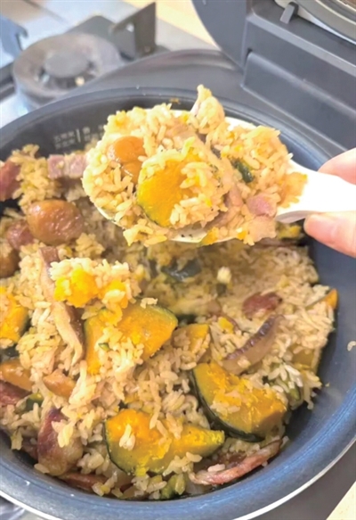 黄女士说,2月8日,她和丈夫开车从浙江回安徽老家过年。出发前,她用电饭煲做了一锅南瓜板栗香肠焖饭,带上了车。中途肚子饿了,他们就找个出口下高速,吃自带的饭,感觉特别香。