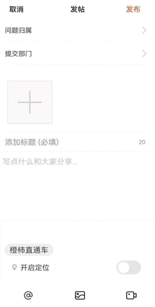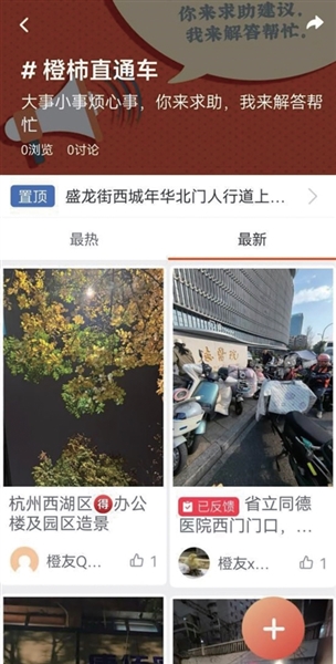其中,橙柿直通车的帖子,还将在标题前显示用户所反映问题的解决进度,即问题是否解决,或是否反馈给有关部门,都会做出标注。如果想查看橙柿直通车全部的帖子,只要点击橙友圈首页右上角的“求助”,即可进入橙柿直通车页面,你有意见和建议,想要反映问题,点击页面右下角的“+”,填写问题归属,拟提交的部门,以及问题和标题,完成后发布就好了。