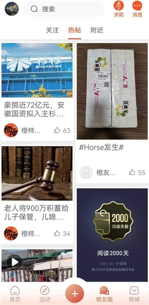 橙友圈页面的内容变得更丰富了,这里除了用户发的帖子,还有新闻、橙柿直通车、活动、视频等,这些内容以帖子的样子呈现,点开后就能进入详情页面。