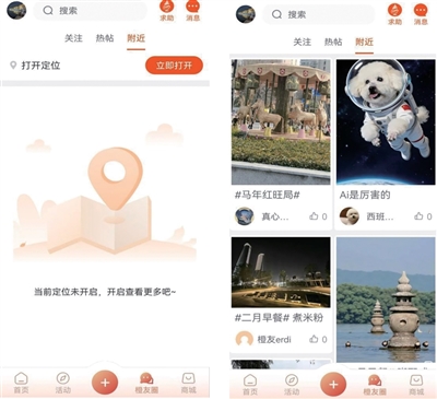 “附近”类别里的帖子,就是在一定地理范围内的用户所发帖子形成推荐表。如果你发完一条帖子,发现附近就有自己关注或认识的橙友,不妨和对方发个私信,说不定还能约见。这种感觉就是:“呀,原来你刚好也在附近啊,走,一起逛个街去。”当然,附近功能是一项选择性功能,如果不想用,选择不开启就可以了。如果想用,打开定位就开启了,开启后可以查阅更多与附近相关的内容。