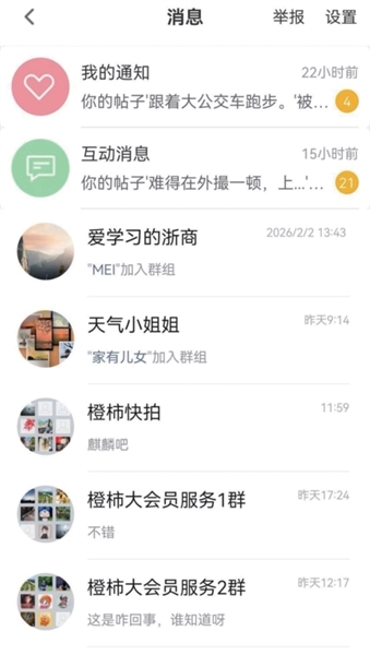 橙友圈原有的搜索功能还是保留的,位置依旧是设置在页面的顶端。键入搜索的关键词,可以得到相应的结果。橙友圈首页右上角和“求助”并列的“消息”,就是你和橙柿互动的互动消息,这里有“我的通知”“互动消息”以及你加入的橙柿分享群发布的消息。互动消息就是大家常说的“站内信”,一般橙友参加福利活动的中奖信息,就可以在这里查询。
