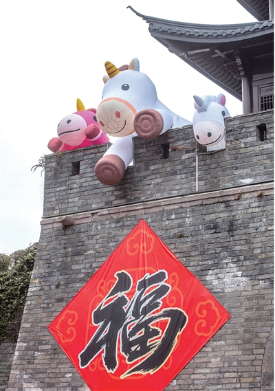 庆春路环城东路口的“古庆春门”城楼上,探出三匹“福马”,萌态十足。记者 陈中秋 摄
