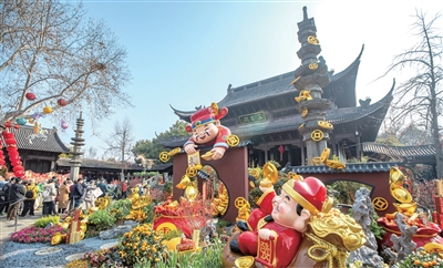 马年新春,钱王祠热闹非凡,西湖迎春花展的花艺景观生动喜庆,年味十足。 记者 陈中秋 摄
