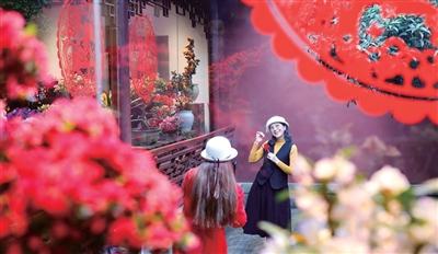 春晚节目《贺花神》的后劲仍在,不少人正月初一早早来到钱王祠赶花事。
