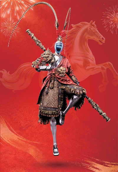 在春晚义乌分会场上,宇树科技机器人完成了一次真实场景中的赛博跃迁。全新的人形机器人H2,身高约一米八,披上《黑神话:悟空》手办的全套铠甲,灵活翻腾,挥舞金箍棒,脚踏筋斗云,穿梭于义乌国际商贸城之间,最终从天而降,落于巨蛋剧场,这是对传统文化的致敬。
