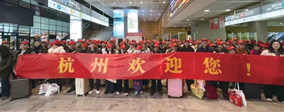 车站出口处,“杭州欢迎您”“欢迎黔东南老乡来杭”等横幅高高举起。“没想到还有接站服务,看到这个牌子,心里暖暖的。”26岁的王强拉着行李箱走出闸机口,看到这么有“仪式感”的接站,不由得咧嘴笑了起来。