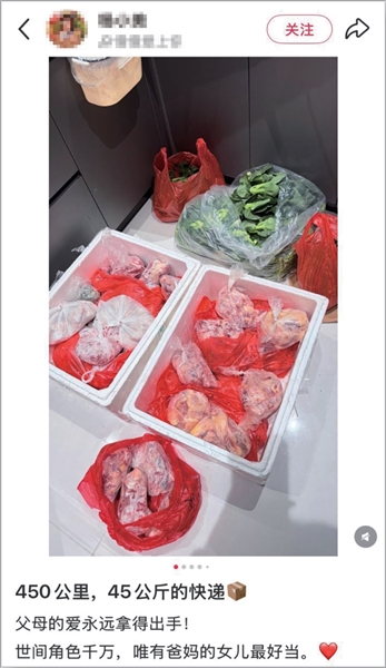 在小红书上,很多博主晒出了今年从老家回工作的地方,爸妈准备的年货,而与之相应的照片,却不再是轿车的后备厢,而是快递的泡沫箱:“450公里,45公斤的快递。父母的爱永远拿得出手!世间角色千万,唯有爸妈的女儿最好当。家养一年的鸡,2只老母鸡,6只公鸡,全部洗净切块分装,半只一份。鸡杂处理好用保鲜袋分装。肥肠、猪肚、牛板肚、牛肉、猪蹄也都是按每份的量洗净切割分装后,冷冻好装进泡沫箱。包饺子的猪肉馅搅碎冷冻好2斤一包,荠菜焯过水冷冻成一团一团。还有数不清的青菜、香菜、菠菜、葱蒜。一边拆箱,一边掉眼泪,老父亲和老母亲从准备这些到快递送出,至少准备了一周吧。”