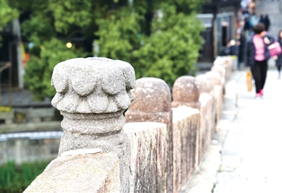 广济桥长78.7米、宽5.2米,桥身以素面石栏板、卷云纹抱鼓石和64根望柱构成。从桥的一边走到中央最高处有80级台阶,石板表面布满细密菱形纹路,既能防滑,也透露出古朴的质感。顶部桥面有浮刻牡丹团花,望柱饰以覆莲,桥孔顶部更有双龙戏珠、鲤鱼跳龙门等精美图案。站在桥上眺望,两岸白墙黑瓦、古色古香的江南水乡建筑连成片,运河水面平静开阔,如一幅画卷徐徐展开。丰子恺曾说:“江南佳丽地,塘栖水乡是代表之一。”
