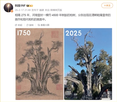 网友将“二将军柏”与乾隆的画作做对比 图据大河网官方微博