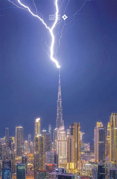 迪拜媒体办公室3月26日发布照片,闪电击中世界最高建筑——哈利法塔。闪电似乎被安全地引导通过了这座828米高建筑的防护系统。迪拜媒体办公室发布安全警告,敦促居民在当前动荡天气条件下保持警惕。迪拜当局担心,类似的雷暴极端天气或导致防空系统出现故障。