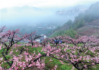 顺着山势抬眼望去,一片片桃林沿着层层梯田铺展而上,像被春风打翻的胭脂盘,在山形间层层晕染。这片粉艳的花海与山间的青竹、田间的油菜花、白墙黛瓦的民居相映成趣,在山间云雾中影影绰绰,宛若仙境。