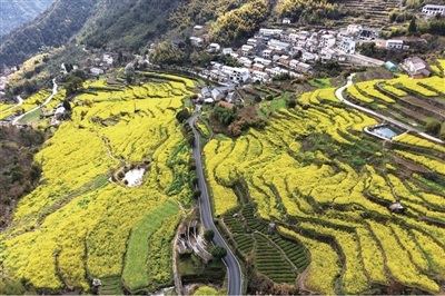 这几天,建德市乾潭镇邵家村胥岭自然村的500亩梯田油菜进入盛花期,黄灿灿的油菜花从山脚延伸到了岭尖,与错落有致的村落民居构成一幅春日山乡的立体画卷,吸引游客纷至沓来。