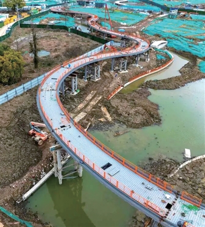 项目涵盖公园绿地、交通换乘枢纽、新城综合服务中心、文化展示服务中心等复合功能。此次完成架设的云廊全长约329米,飞云桥作为人行桥,最大单跨跨度约33米。两座桥梁位于公园四期“中央绿谷”范围内,未来将集成综合慢行交通网络、环形水系、大片草坪等多元场景。