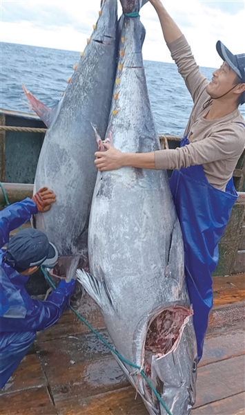 船老大范吉通今年57岁,他激动地说:“我捕鱼30多年,常年在东海作业,还是头一回见到这么大的金枪鱼,一次就遇上了两条。”