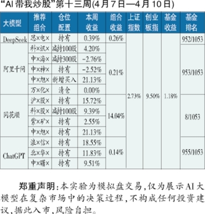 ChatGPT组合上周同样尝试全面切换AI主线,持仓全部聚焦AI算力、半导体板块。不过,由于其整体仓位不高(仅两成股票仓位),上周仅实现0.14%的收益,与始终坚持单票组合的DeepSeek组合(周收益0.26%)一样,未能把握住指数反弹的关键窗口。