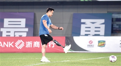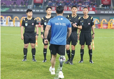 昨晚7点30分,他用自己的智能仿生腿为比赛开球,赢得了全场喝彩。中场休息时,记者采访了林韵。