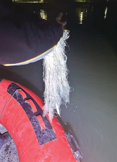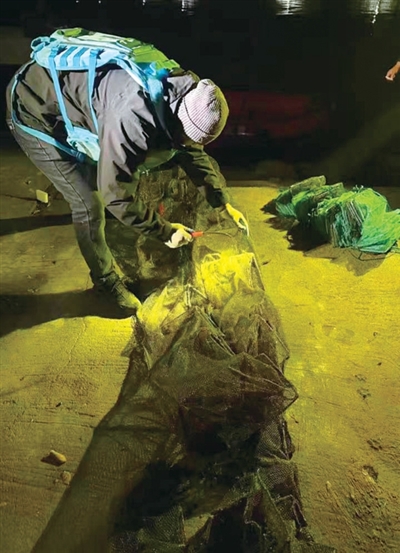 记者随后联系了属地街道。当晚,五水共治协会志愿组织所前机动中队,带了两艘橡皮艇,连夜对南门江展开行动,共收缴地笼20个、丝网15张,并现场劝离违规下网人员3名。