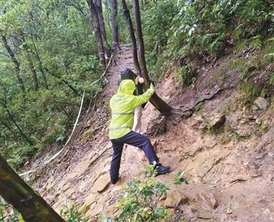 前天,有男子跟风网络攻略到西湖群山爬山,没想到山体滑坡把路挡住了,无法前进。山路被连日雨水浸透,泥泞不堪,部分路段还滑坡塌陷,“只能借助旁侧树木勉强通行”。三人深一脚浅一脚,在湿滑陡峭的山径中艰难攀爬。