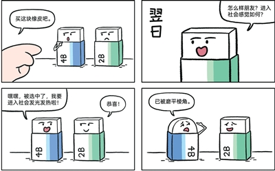 两块橡皮又碰面了,2B很高兴,4B却有些开心不起来,因为它原本棱角分明的脑袋,现在已经被磨平了棱角,变成一道软软的“拱形门”了。