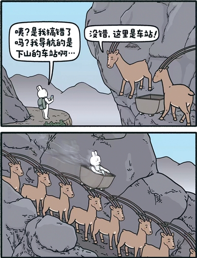 游客兔子先生刚从山上下来,它用手机导航了下山的车站,到了目的地却发现这里只有两只羚羊。