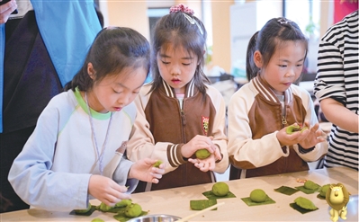 春天独有的美味 青团是春天独有的美味,藏着满满的传统韵味。金山小学302班的同学们将清香的青汁与糯米粉揉匀,包上豆沙、春笋肉等馅料,做出了美味的青团。有人还创意十足地做出饺子形、葫芦形等可爱模样。