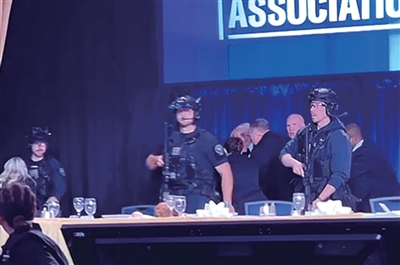 特勤局特工高喊有人开枪,先将万斯迅速从舞台右侧送走,持枪人员赶来原地护卫特朗普,然后护送他和梅拉尼娅离开。特朗普行动较迟缓,特工围着他从舞台左侧离开,还在出口处跌了一跤。