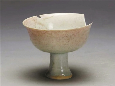 并不完整的元代影青釉里红高足杯,是杭州博物馆的“明星”文物,人气很足。这件1987年出土于杭州的元代文物,高9.7厘米,口径为12厘米,足径为4.4厘米。元代影青釉里红高足杯的外形像蘑菇,由“碗”和高柄组成,是典型的元代游牧民族饮酒器,碗口较大,下端高足可绑绳子系在马背上,故又名“马上杯”。