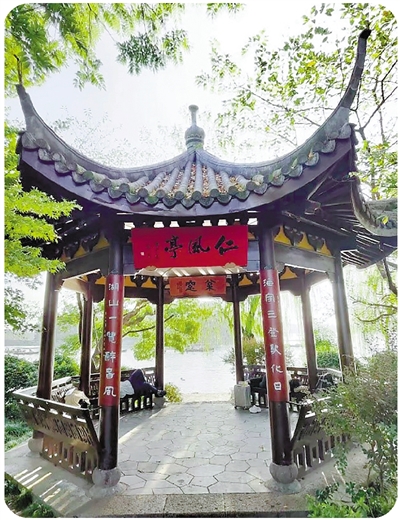 那年我游苏堤,看到了此景,想着“仁风亭”是与杭州抗战有关的一座亭子,但知道的人已经很少了,于是便向有关部门反映,将这段鲜为人知的历史告知。有关部门的同志得知后相当重视,迅即让人将董石良先生题写的“仁风亭”匾额重新悬于亭前,“松窗”匾额则悬于亭内。