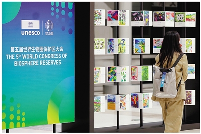 9月22日,代表在参观第五届世界生物圈保护区大会设置的儿童画国际巡展。当天,由中国科学院与浙江省人民政府联合承办的联合国教科文组织第五届世界生物圈保护区大会在浙江杭州开幕。 新华社记者 黄宗治 摄