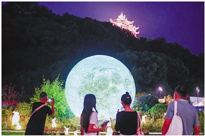 中秋佳节,一轮直径3米的“超级月亮”在吴山广场的花海里“升起”,与灯火辉煌的城隍阁相呼应。记者 李忠 摄