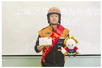 昨天下午,在上城区新就业群体党群服务中心,杭州市见义勇为基金会为柴振朋颁发了“杭州市见义勇为积极分子”荣誉证书及1万元奖金。此外,上城区委社会工作部、上城区公安分局、彭埠街道及淘宝闪购等单位也纷纷到场表达慰问。