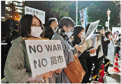 11月21日,在日本东京的首相官邸外,民众手持标语参加抗议活动,要求日本首相高市早苗撤回错误言论。新华社记者 贾浩成 摄