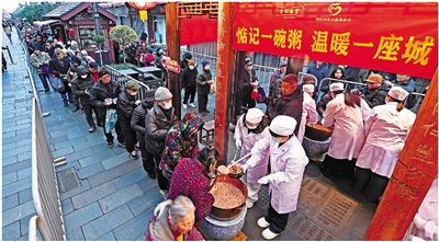 大图:1月26日,腊八节。市民在河坊街方回春堂排队领取腊八粥。记者 李忠 摄