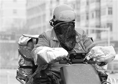 12月13日,在天津市南开区,一名外卖骑手身着御寒装备在骑行途中。受强冷空气影响,预计12月13日到15日,天津将出现明显降雪过程。天津气象台于13日分别发布暴雪黄色预警、道路结冰黄色预警、海上大风黄色预警、寒潮蓝色预警四重气象预警信号。