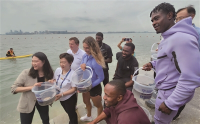 4月27日,参加2025世界田联钻石联赛厦门站赛事的5名外国田径运动员代表在福建厦门参加可持续发展公益增殖放流活动。这是5名外国田径运动员代表与厦门市区相关部门负责人一同参加真鲷鱼苗增殖放流活动。