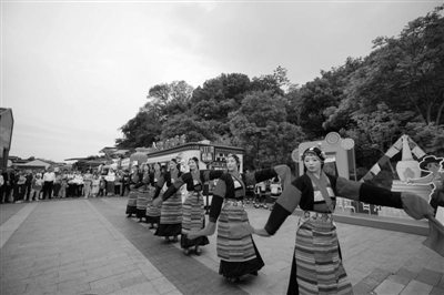 来自甘孜州的舞蹈演员在吴山广场上表演藏族舞蹈,吸引了不少游客驻足观赏