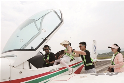5月3日,在重庆市永川区大安通用机场,鹿峰航空专业人员引导小朋友体验低空飞行。