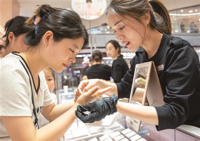 5月3日,江苏省南通市通州区金新街道一大型商场内,顾客选购黄金饰品。
