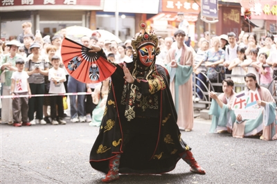 5月3日,游客在四川省乐山市特色文化街观看川剧变脸表演。
