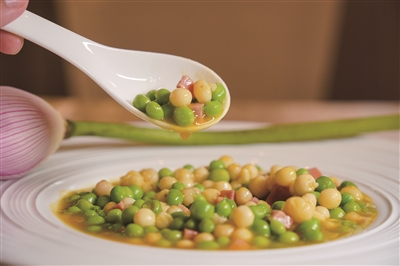 这道菜的“金汤”堪称点睛之笔:南瓜蒸熟后捣成蓉,加入用里脊肉、鸡胸肉剁成肉糜后熬汤。南瓜蓉让汤呈现出琥珀金色,倒入焯熟的鸡头米与甜豆,便是“金镶玉”般的气象。