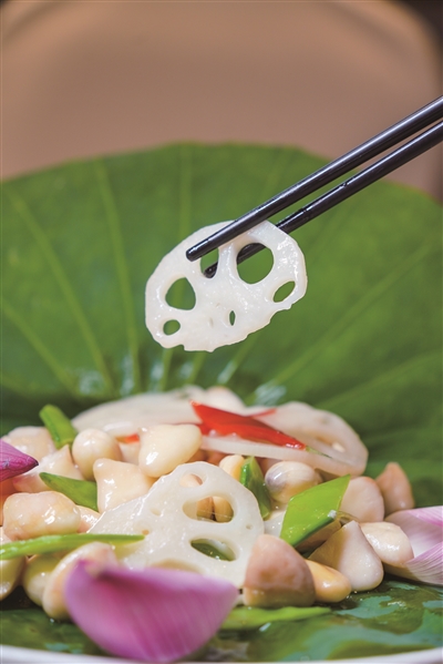 韩强指着盘中藕片说:“古代运粮船经过杭州,船工们常采河塘野藕充饥,后来逐渐衍生出荷食文化。”如今他将这份朴拙的饮食智慧升级为艺术:荷花的清雅对应文人雅士的赏荷雅集,莲藕的通达暗合运河“贯通南北”的精神,而莲子的回甘,则恰似运河千年流淌的绵长韵味。