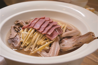 而烹饪方式,也是颠覆了传统炖法,上笼干蒸3小时。干蒸的妙处在于逼出鸭肉本身的油脂,却不让它混入汤中。只见汤色清如琥珀,鸭肉表面呈浅棕色,用筷子轻戳即透。尝一口汤,火腿的咸鲜、笋干的清冽。最后以一丝回甘收束,完全没有传统老鸭煲的油腻感。
