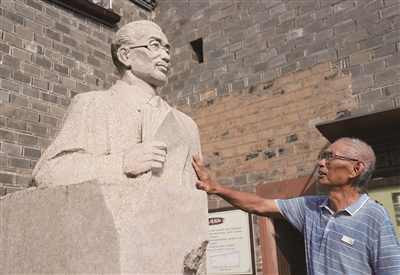8月1日,78岁的梅氏家族长辈梅华林在梅汝璈故居院中瞻仰梅汝璈雕像。新华社发