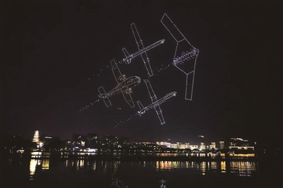 7月11日晚在重庆市梁平区双桂湖国家湿地公园拍摄的无人机表演