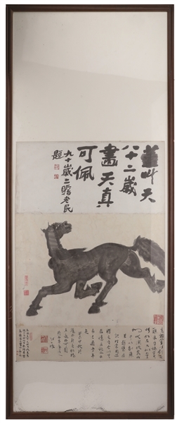 在中国传统文化里,马象征着吉祥、勇敢与不屈的精神,而盖叫天笔下这匹 “龙驹”,正是他艺术生涯的生动写照。画作上方有当代著名画家朱屺瞻的题跋 “盖叫天八十二岁画天真可佩”,下方则由其嫡孙张大根题跋 “先祖盖叫天故居恢复旧貌,以先祖所作龙驹图当属镇宅之宝也”,两处题跋既彰显了家族血脉的延续,也传递了艺术传承的温度。作为盖派艺术的经典之作,这幅《墨马图》不仅是一件珍贵的书画藏品,更是杭州近现代文化发展历程的鲜活见证。