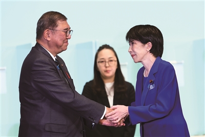 10月4日,在日本东京的自民党总部,高市早苗(右)在自民党总裁选举中胜出后向日本首相、自民党前任总裁石破茂(左)致意。 新华社发