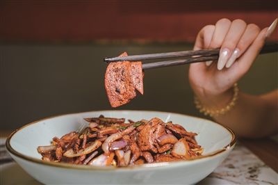 猪肝拌川作为“弄面”的招牌,也是第十届杭州面条节的赠面。端上桌时卖相先赢了,碱水面裹着油亮的酱汁,根根分明不粘连,大片猪肝铺在面上。“选猪肝得是那种拿在手里沉甸甸、捏着不软塌,没有怪味的。当天的猪肝当天用完,不会留到第二天,客人吃的必须是新鲜的。”金宏伟说。